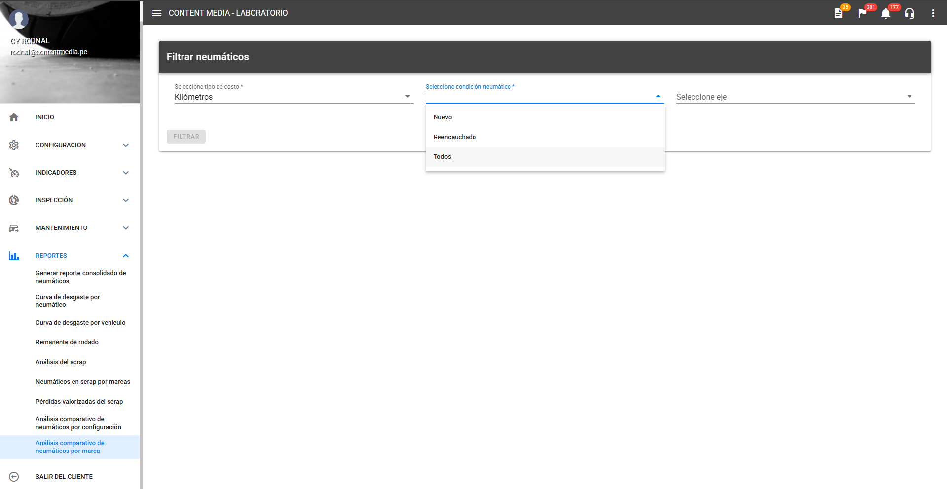 Muestra el detalle de la selección del filtro Seleccione condición neumático. El usuario puede optar por comparar el desempeño de neumáticos Nuevos, Reencauchados o Todos, permitiendo un análisis diferenciado de la durabilidad según la condición.