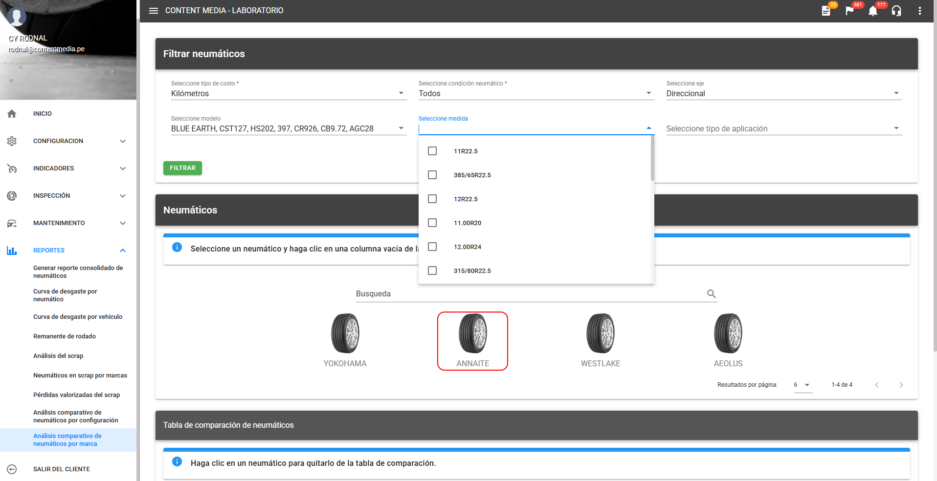 Muestra la aplicación de filtros detallados. El usuario puede filtrar por Modelo (ej. BLUE EARTH, CST27), Medida (ej. 385/65R22.5) y Eje (ej. Direccional) antes de seleccionar las marcas. Esto asegura que la comparación se haga entre marcas con características técnicas similares. La marca ANNAITE está seleccionada visualmente.