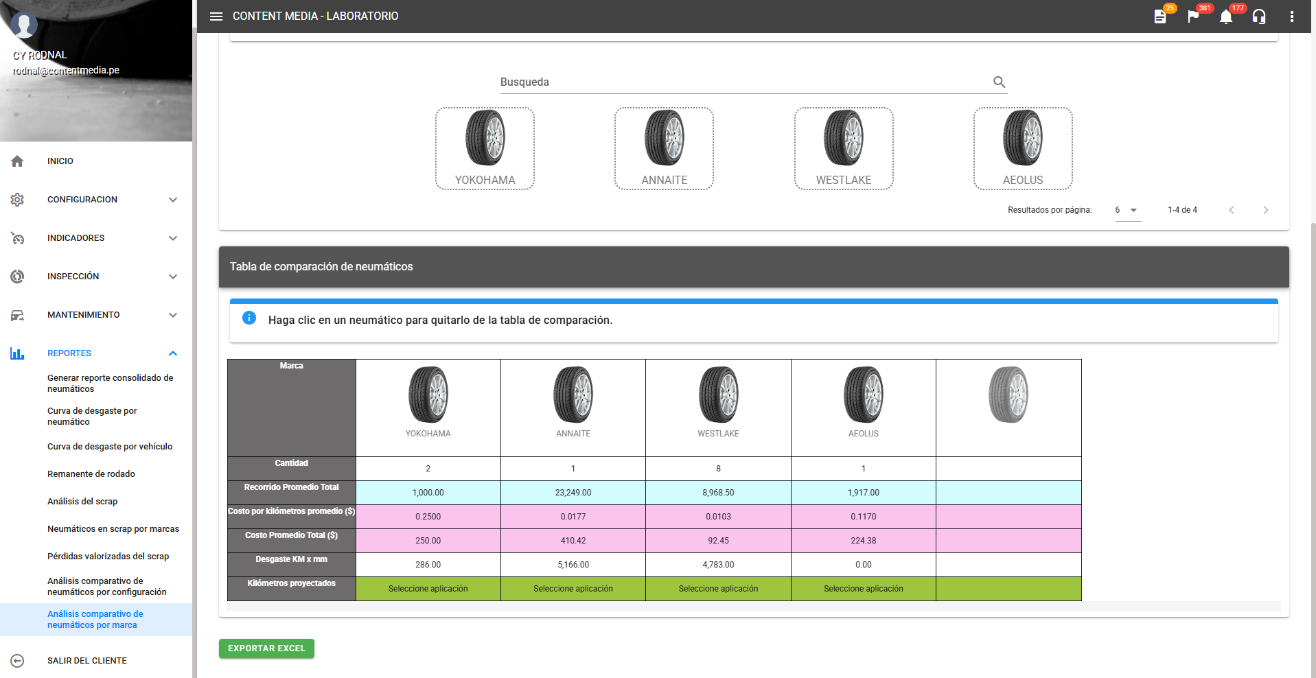 Muestra la Tabla de comparación después de que el usuario ha seleccionado varias marcas (ej. YOKOHAMA, ANNAITE, WESTLAKE, AEOLUS). La tabla consolida métricas clave por marca, incluyendo la Cantidad de neumáticos en la muestra, el Recorrido Promedio Total, el Costo por Kilómetro Promedio ($) y el Costo Promedio Total ($). Esto permite una rápida visualización del rendimiento y costo-efectividad entre fabricantes.
