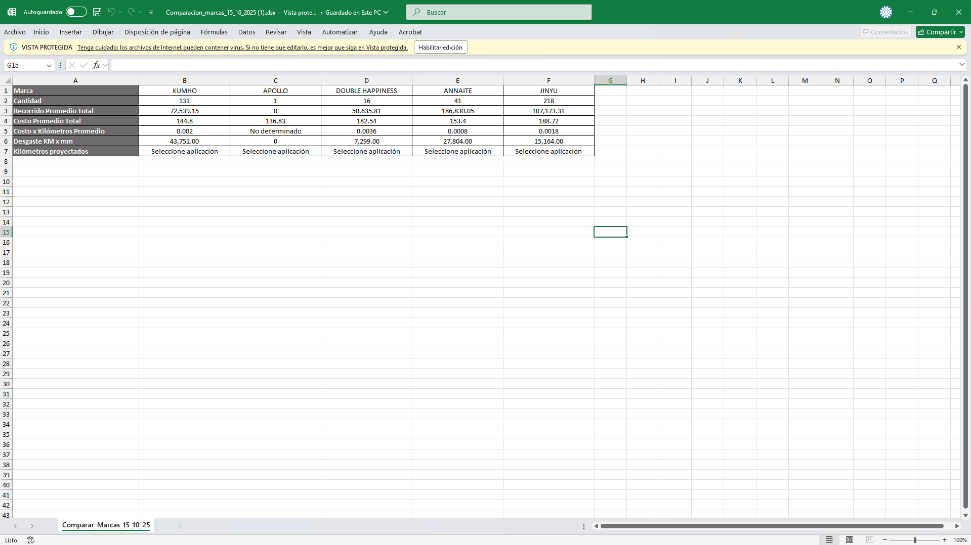 Hoja de cálculo generada tras la exportación. Presenta un resumen de los resultados comparativos por marca (ej. KUMHO, APOLLO, DOUBLE HAPPINESS, ANNAITE, JINYU). Las métricas incluyen la Cantidad de neumáticos, el Recorrido Promedio Total, el Costo Promedio Total y el indicador clave de Costo x Kilómetro Promedio, crucial para evaluar la rentabilidad.