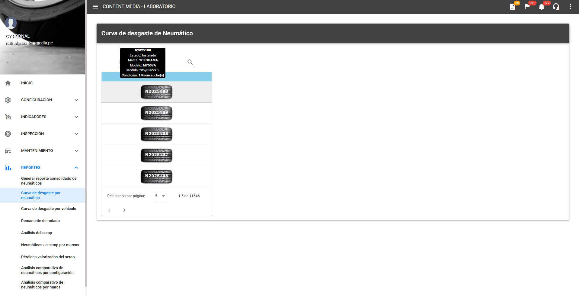 En esta vista se muestra el listado de neumáticos registrados. Cada neumático se identifica por su código y una imagen representativa. Al pasar el cursor, se despliega una ventana con información detallada: estado, marca, modelo, medida y condición.