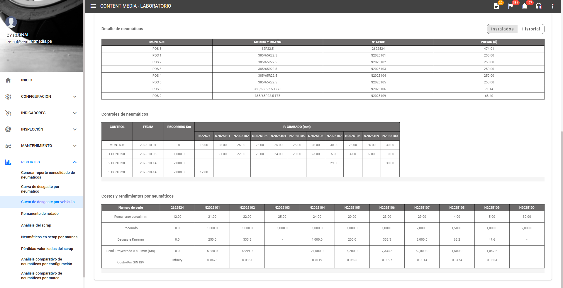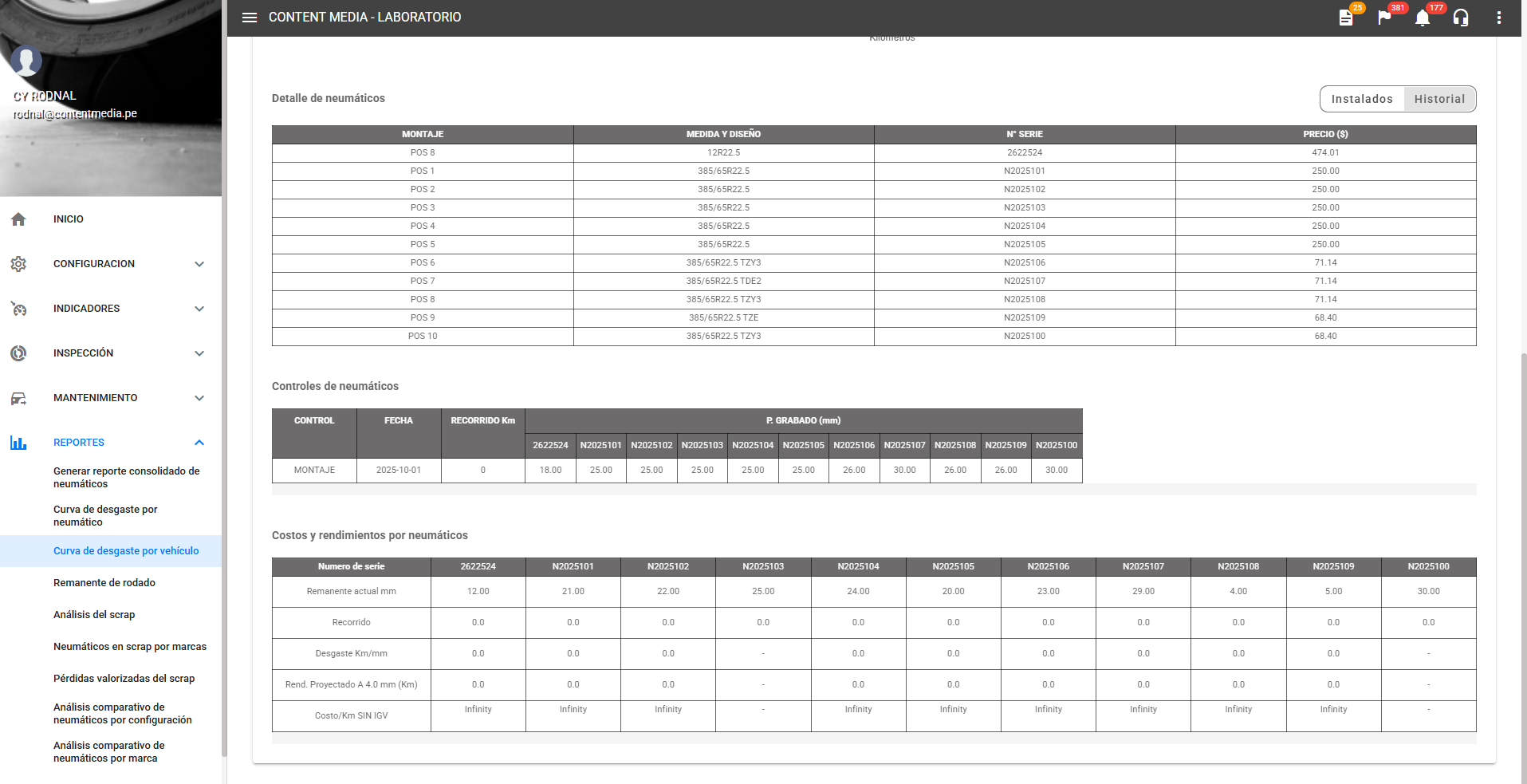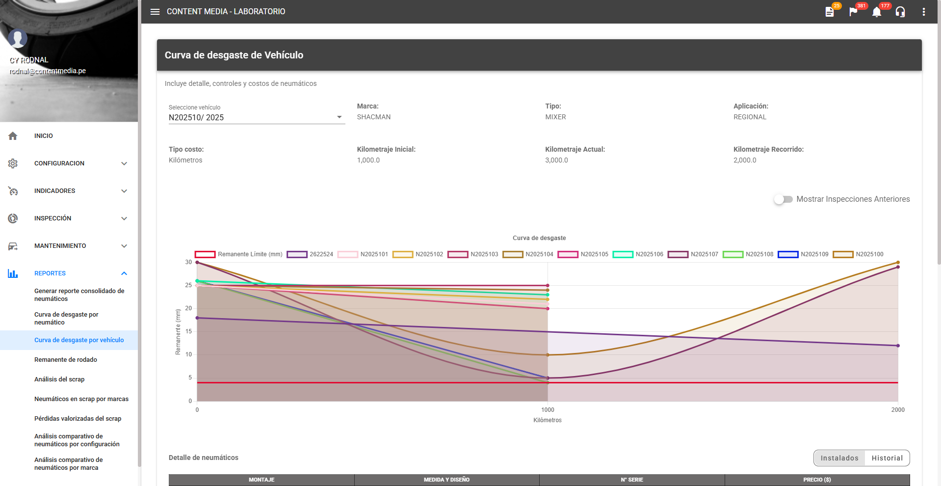 Visualización con inspecciones anteriores esta vista permite activar la opción Historial para listar los mostajes, controles, costos y rendimientos de los neumaticos pasados montados en el vehículo. Facilitando el análisis histórico y observar los datos de neumaticos instaladas anteriormente.